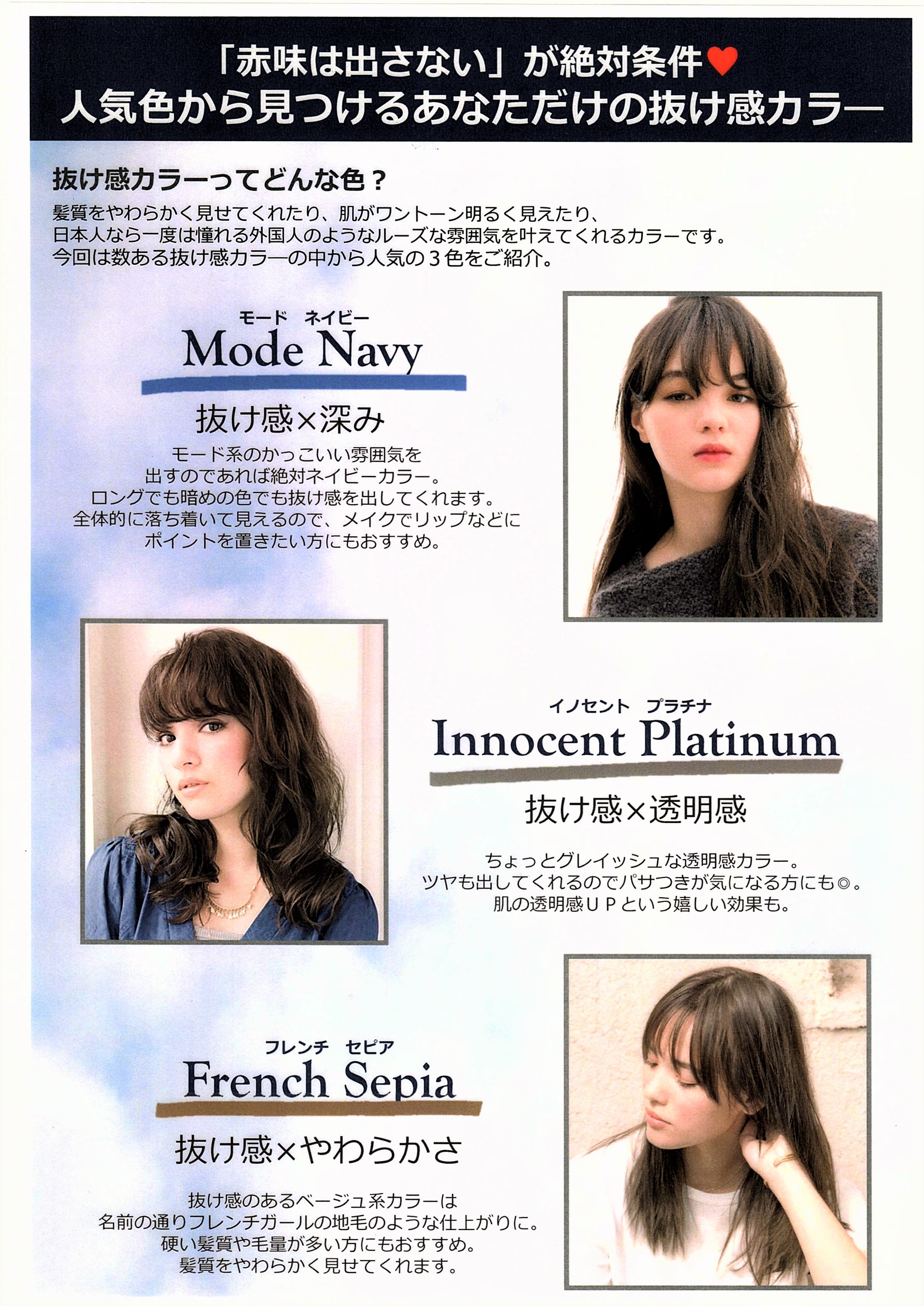 2016/09/02 Fri 2016 AW新色カラー デビュー 前橋市の美容室イズムフィエット ワクワクのおしゃれの秋 今回は2016AW 秋冬の新色カラーのご案内です 9月3日デビュー予定 まだまだ残暑が続きますが季節は秋ですね!一足早くライバルに差をつけよう!! まずは新色のネーミング 1 モードネイビー 2 モードマットネイビー 今年のトレンド・・・抜け感カラー おすすめカラーのご提案は・・・これだ! 1モードネイビー&マット 深み 2イノセントプラチナ 透明感 3フレンチセピア やわらかさ 深み 透明感 やわらかさ どれにしましょうか? ネイビー, 2016新色 前の記事へ 次の記事へ